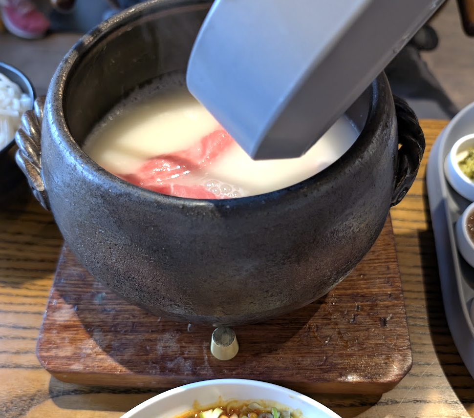 次に、非常に熱いスープ(鉄鍋みたいなボール)が運ばれてきます。こちらは12時間以上煮込んだ濃厚なスープで、香りも味わいも格別です。
